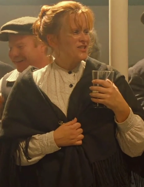 She is then seen in the third class party scenes here and there. She is the woman who exclaims, "Jesus, Mary and Joseph!" as a reaction to Rose's toe-standing skill. Later on in the film, as the ship is tilting, she can briefly be seen with her husband and other passengers on the deck holding onto Thomas Byles as he quotes the Book of Revelations.